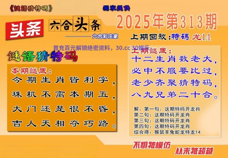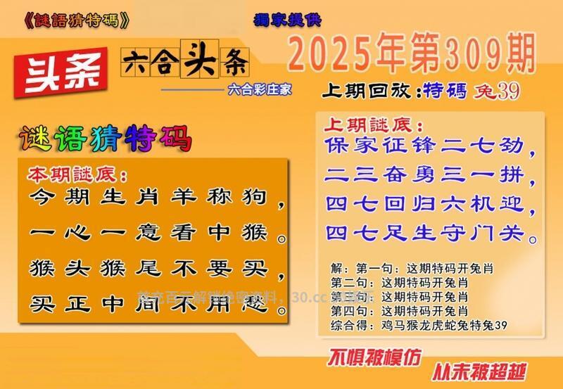| 313期 今期生肖皆利字 珠机不商本期五 大门还是很不昏 吉人天相夺巧路 解译:大门还是很不昏指大肖牛马羊狗虎猪,吉人天相夺巧路指天肖牛马龙羊猴猪 九肖:牛马羊狗虎猪兔龙猴 |
