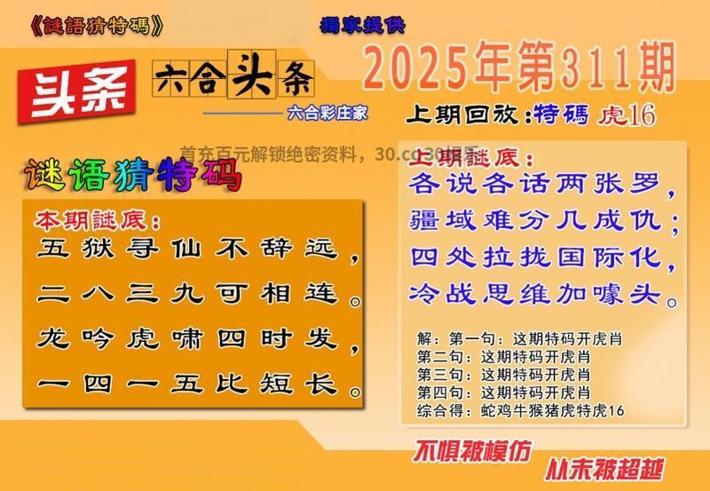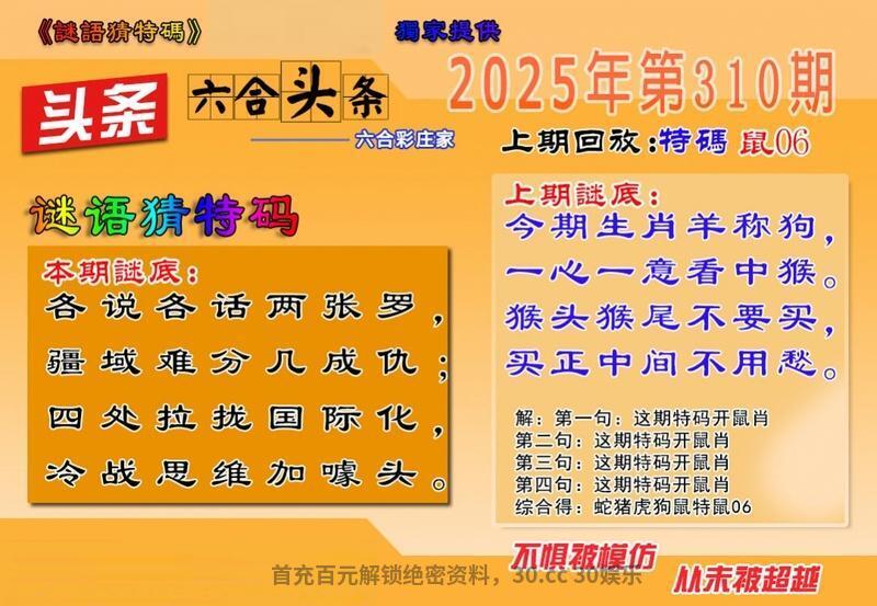 | 310期 各说各话两张罗 疆域难分几成仇 四处拉拢国际化 冷战思维加噱头 解译:四处拉拢国际化指04虎,冷战思维加噱头指战肖虎马狗牛 九肖:虎马狗牛龙蛇猪鼠兔 六肖:虎马狗牛龙蛇 三肖:虎马狗 一肖:虎 特码:16.40.12.36.32.44.05.41.14.38.01.13 |